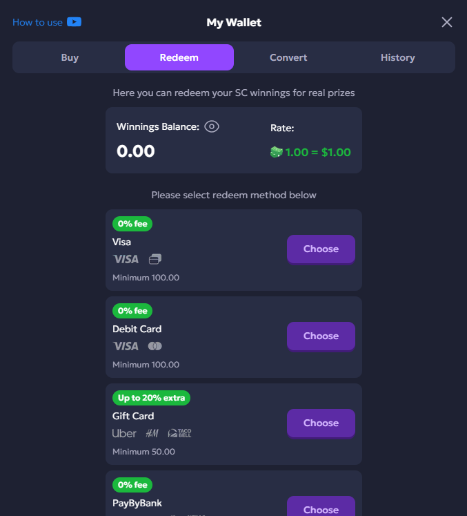 With Sweepstakes Coins, it's the same games, same plays — and same wins. The redemption process is clear, easy, and fast. Read the rules carefully because they may differ from one website to another. For instance, at Chip’n WIN, you can start redeeming as soon as your balance reaches 25 winnings.
